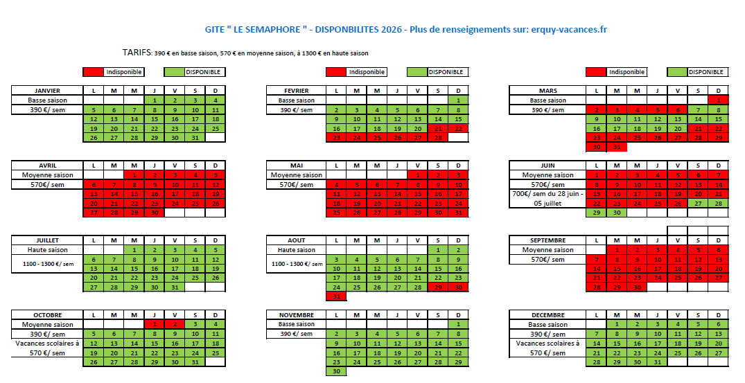 - Arrhes : 25 % - Caution : 300 € - Option-ménage : 70 €